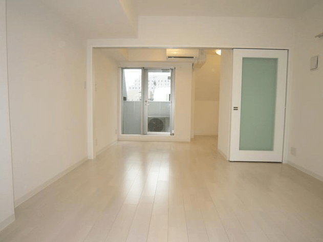 ビバリーホームズ東高円寺206 キッチンから見た居間バルコニー窓とフローリング